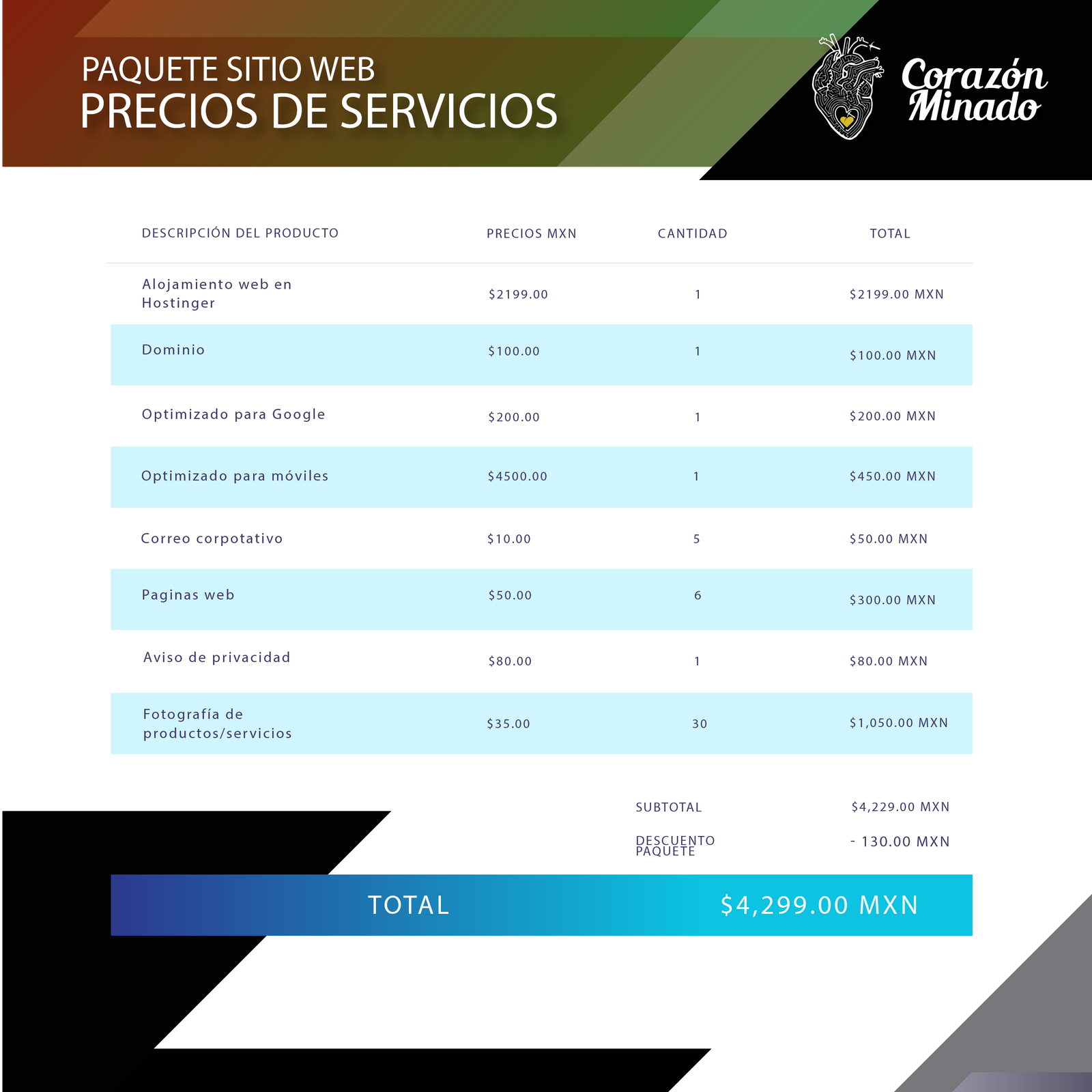- Un sitio web con 4 a 6 páginas